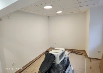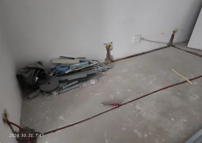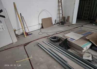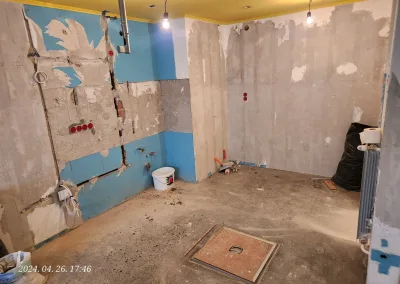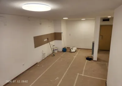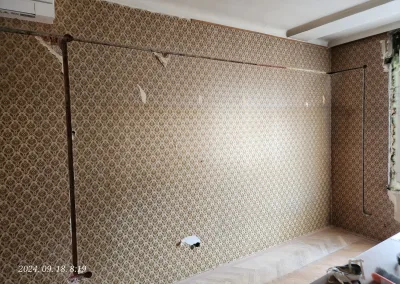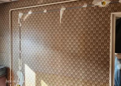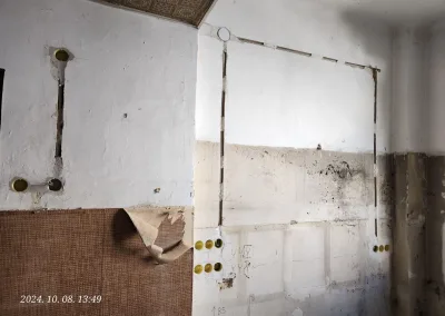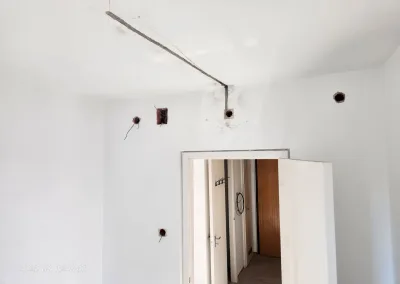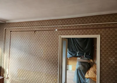 A lakás kisebbik része valamikor már át lett vezetékezve, de nagyobb részében még alumínium kábelek voltak a vakolat alatt. Ezek helyett kellett új nyomvonalat kialakítani és réz vezetékeket behúzni a tulajdonos által megjelölt dugaljakhoz, kapcsolókhoz, lámpákhoz.